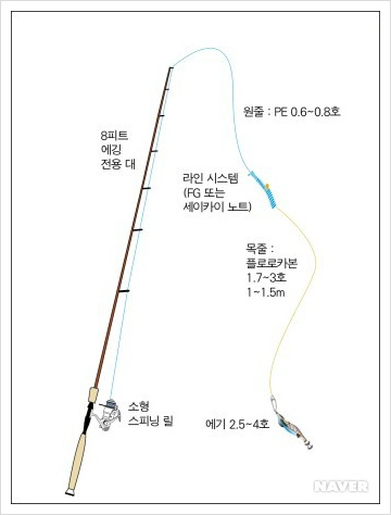 에기 낚시를 위해서는 8피트가량의 에깅 전용 낚싯대를 사용하는 것이 좋습니다.